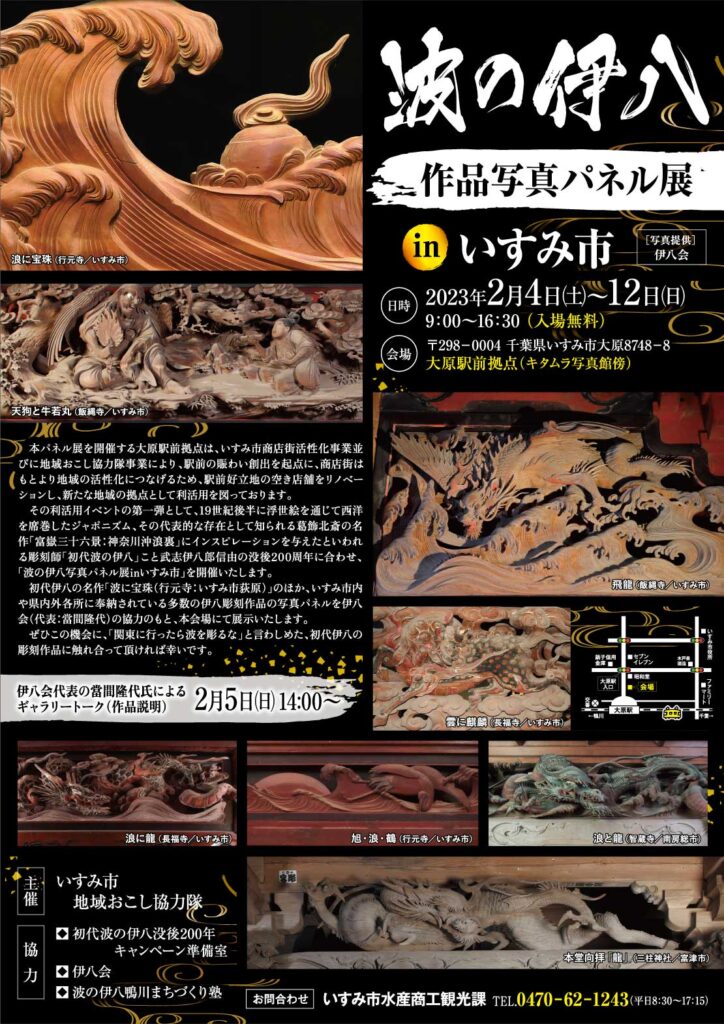 初代伊八の名作「波に宝珠(行元寺:いすみ市荻原)」のほか、いすみ市内や県内外各所に奉納されている多数の伊八彫刻作品の写真パネルを伊八会(代表:當間隆代)の協力のもと、本会場にて展示いたします。