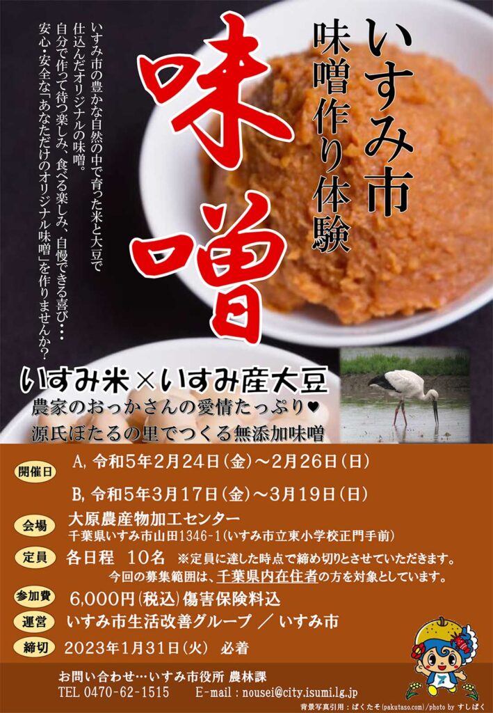 もうすぐ〆切!! 令和5年いすみ市味噌󠄀づくり体験 参加者募集中! 2023年1月25日 最終更新日時 : 2025年9月27日 tourism-isumi いすみ市では令和5年の味噌󠄀づくり体験の参加者を募集しています。 昔ながらの手作業で仕込む、いすみ市産のお米と大豆を使ったオリジナルの味噌󠄀。作って待つ楽しみ、食べる楽しみ、自慢できる喜び…こだわりの素材で作られた逸品を貴方も作ってみませんか。 いすみ市ホームページ(味噌󠄀づくり体験) FacebookXBlueskyHatenaCopy