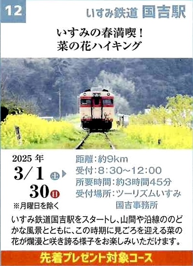 いすみ鉄道国吉駅をスタートする、先着プレゼント対象コース受付をツーリズムいすみの国吉事務所でしております。花も咲き始め、ハイキングにはとても良い季節になりました。プレゼントの個数に限りがありますので、お早めにお立ち寄り下さい。